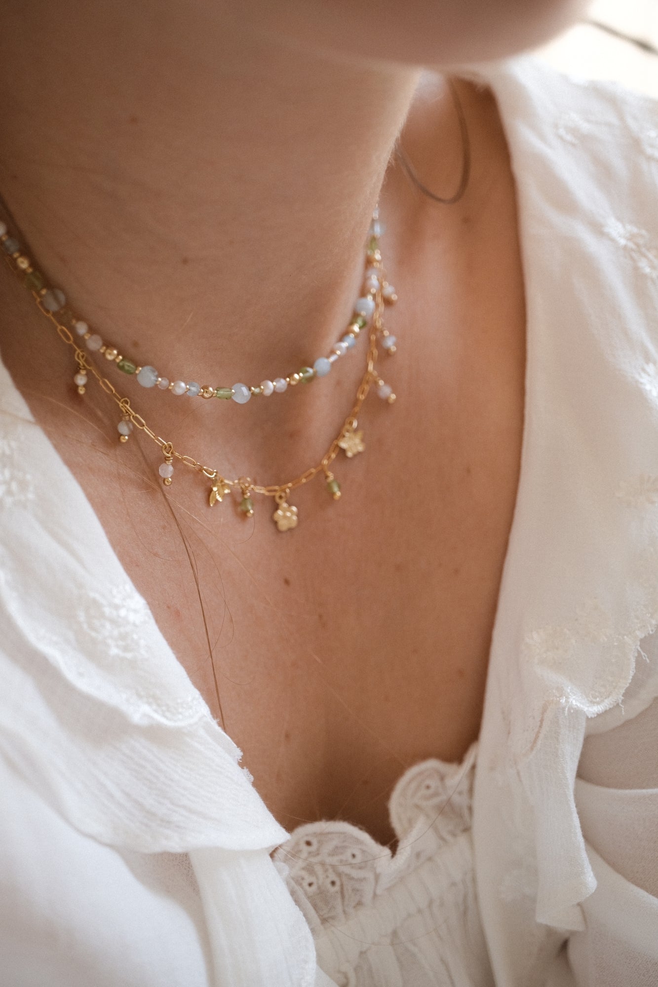 - Matériaux : Nous utilisons du laiton doré à l’or fin 18 carats, associé à des pierres fines et des perles d’eau douce soigneusement sourcées en France et en Europe.